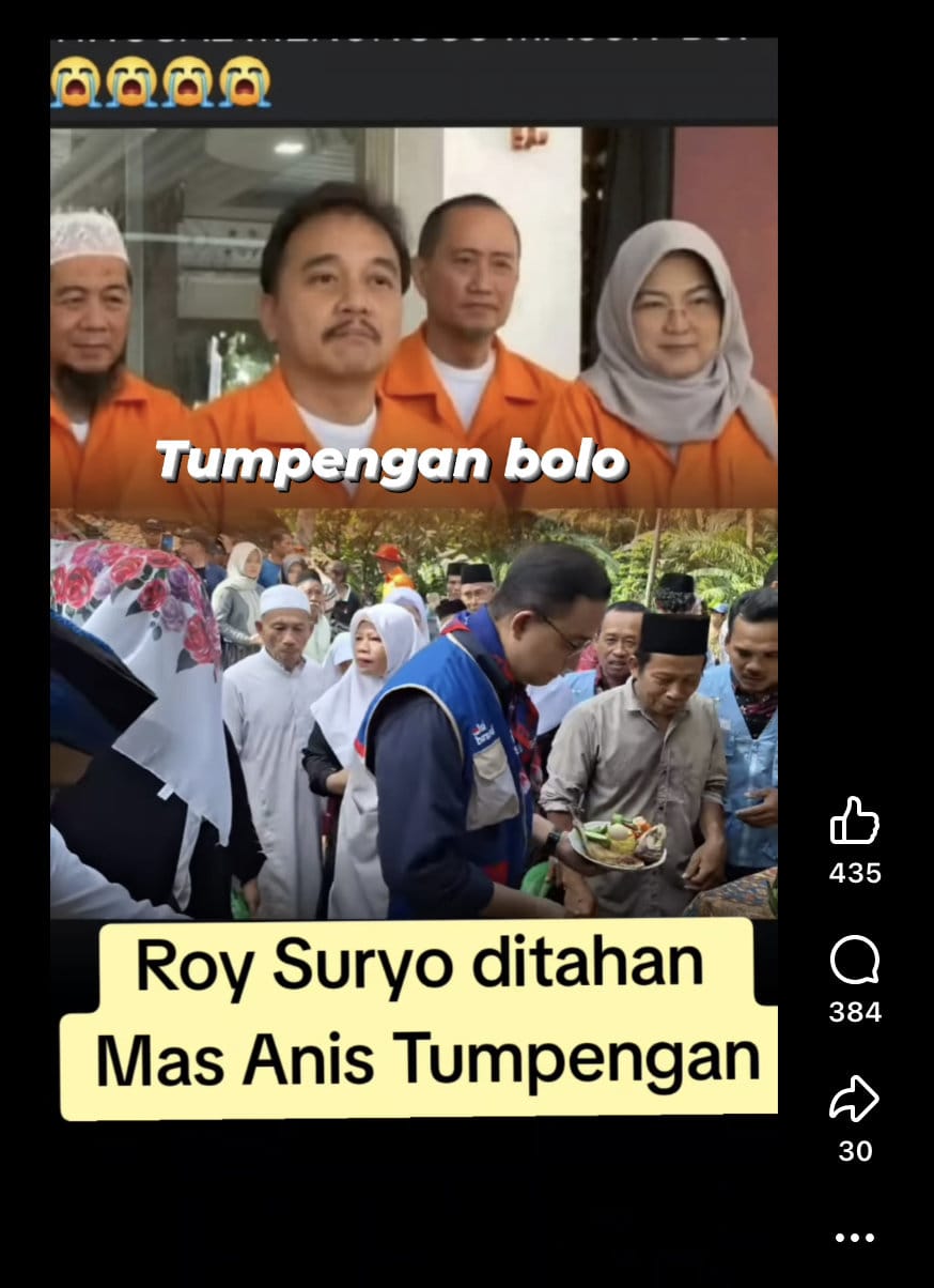 Pasca penetapan status hukum tersebut, beredar sebuah video di media sosial yang mengklaim bahwa mantan Gubernur DKI Jakarta, Anies Baswedan, menggelar acara tumpengan sebagai bentuk syukuran atas kabar Roy Suryo disebut-sebut akan segera ditahan.