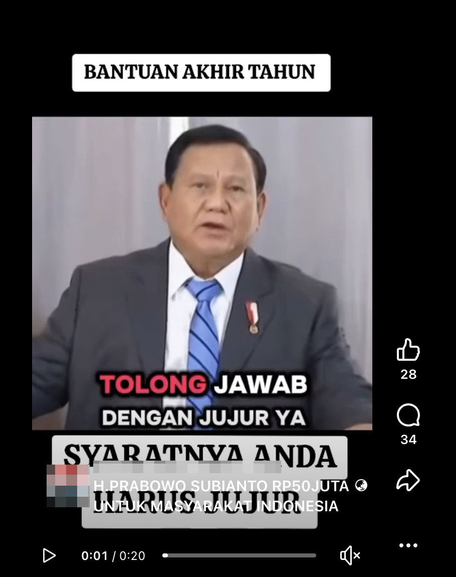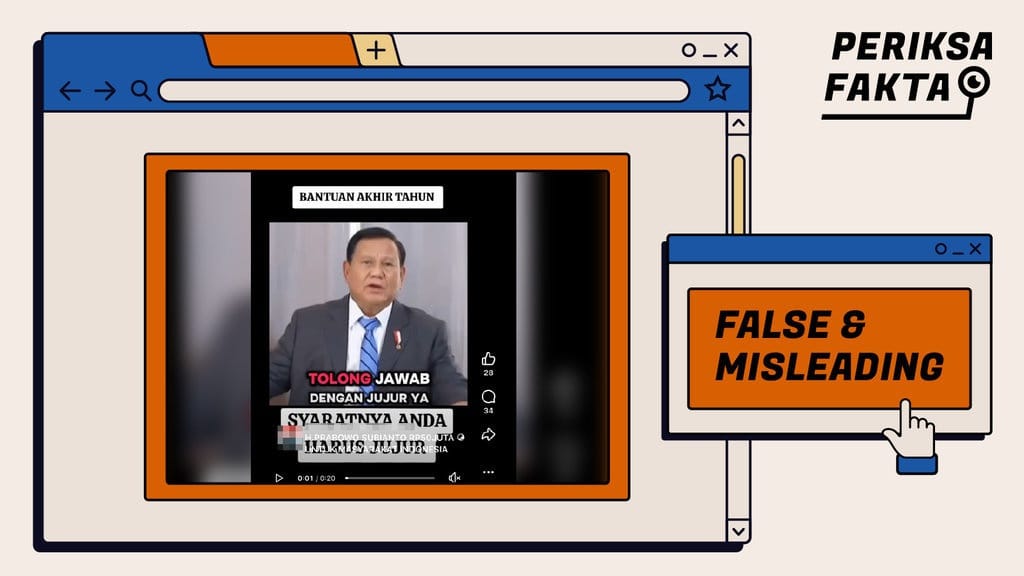 Beredar video yang dklaim menunjukkan Presiden Indonesia, Prabowo Subianto, yang membagikan bantuan sosial akhir tahun untuk masyarakat sebesar Rp50 juta. Beberapa akun dari Facebook dan TikTok mengunggah narasi dan klaim yang sama, yaitu ini (arsip), ini dan ini. Terdapat tulisan "bantuan akhir tahun" di video tersebut.