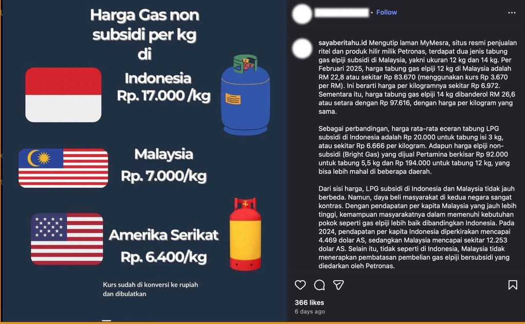 Semua unggahan tersebut menyebutkan infografik perbandingan harga LPG non-subsidi di Indonesia lebih mahal dibandingkan Malaysia dan Amerika Serikat.