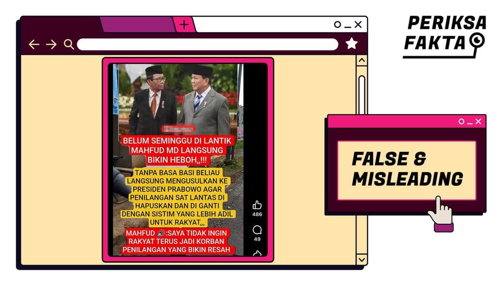 Narasi tersebut juga menyertakan kutipan yang seolah berasal dari Mahfud MD, yang berbunyi, “Saya tidak ingin rakyat terus jadi korban penilangan yang bikin resah."