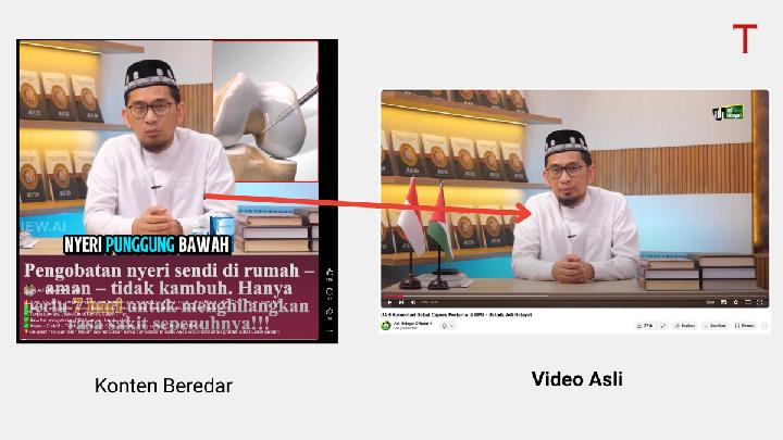Tempo memverifikasi konten itu lewat pencarian gambar terbalik dan menggunakan alat deteksi kecerdasan buatan (AI). Faktanya, Adi Hidayat tidak mempromosikan obat nyeri sendiri dalam video aslinya.