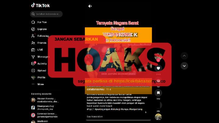 Tempo menelusuri video itu dengan membandingkan kontennya pada informasi dari sumber kredibel serta menganalisis visualnya memakai alat deteksi akal imitasi. Hasilnya, Indonesia tetap mengekspor berbagai komoditas ke Eropa meski tidak seluruhnya bahan makanan. Bagian visual yang diklaim menggambarkan kekacauan di Eropa ternyata sebagian dibuat dengan akal imitasi.