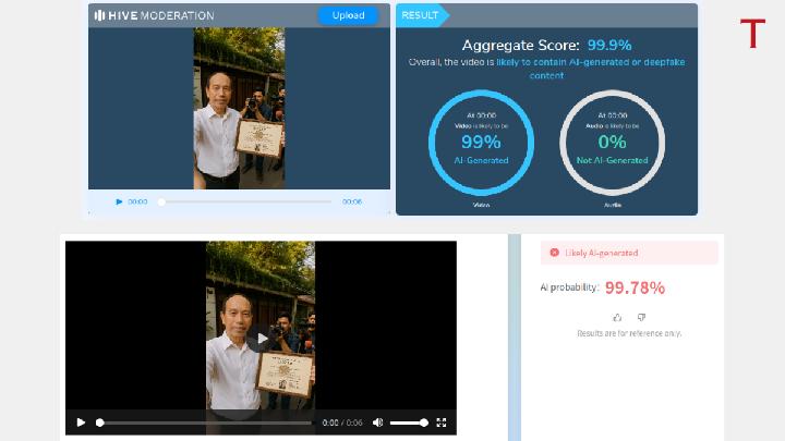 Alat pendeteksi video AI Hive Moderation menyatakan, kemungkinan video pertama dibuat dengan AI mencapai 99,9 persen. Sedangkan analisis dengan alat Zhuque AI Detection Assistant, kemungkinan pelibatan AI mencapai 99,78 persen.