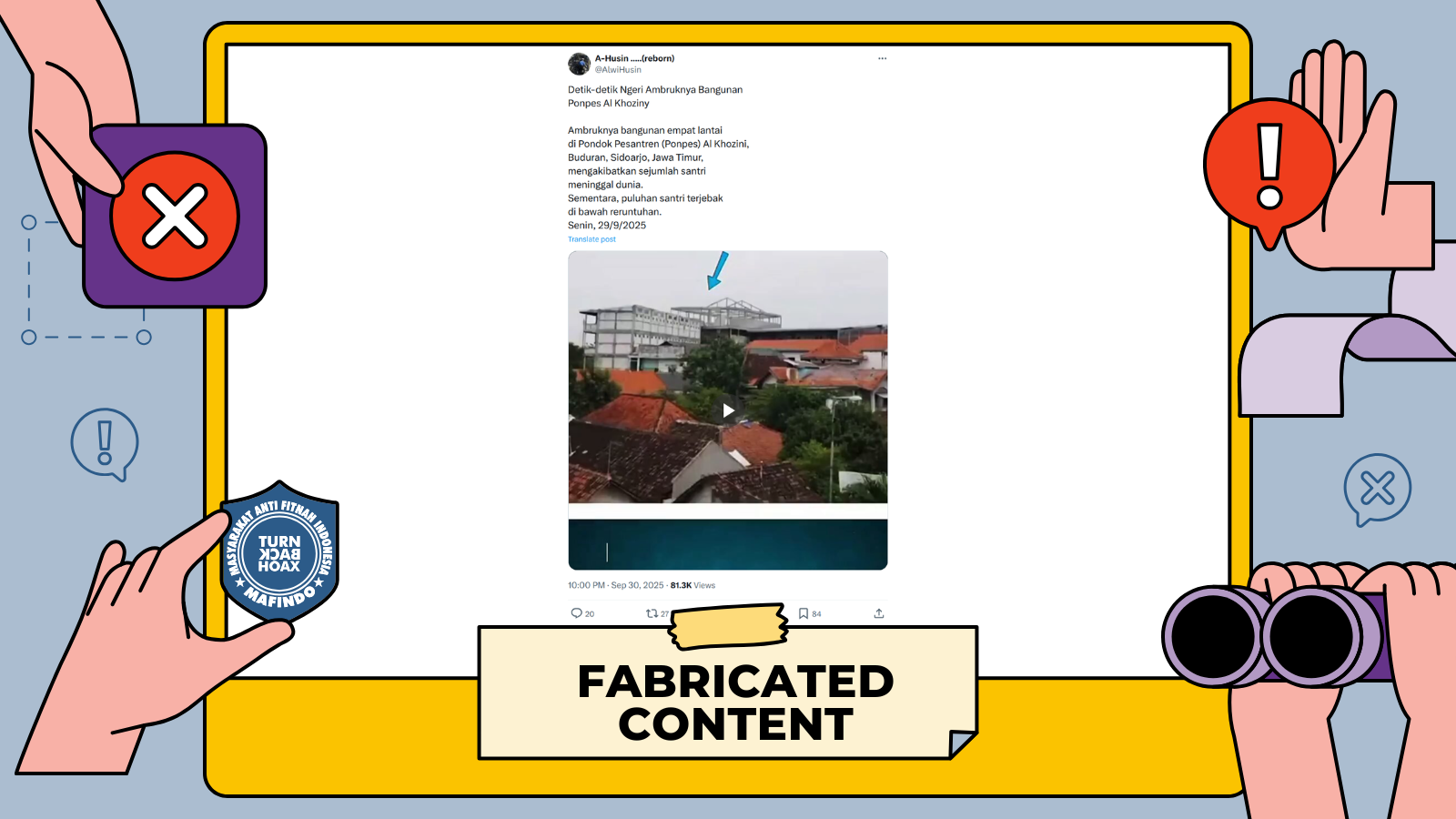 Unggahan video berisi klaim "Detik-detik Ngeri Ambruknya Bangunan Ponpes Al Khoziny" merupakan kategori konten palsu (fabricated content), faktanya video yang disebarkan dibuat menggunakan PixVerse, sebuah platform generator/pembuat video yang menggunakan teknologi AI (Artificial Intelligence).
