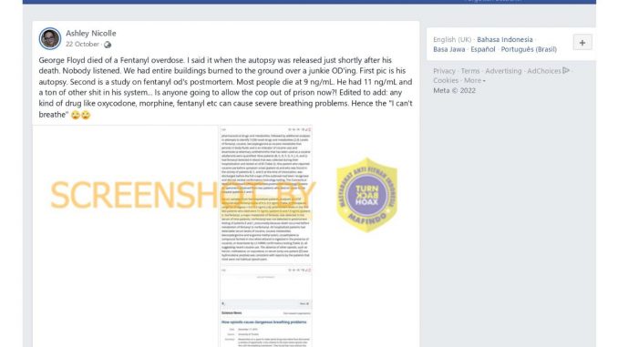 Akun Facebook dengan nama “Ashley Nicolle” menyebarkan informasi dan foto terkait penyebab kematian George Floyd yang terjadi pada 2020 lalu. Dalam unggahan tersebut, Ashley memberikan klaim bahwa kematian George Floyd karena overdosis fentanyl, dan bukan karena pembunuhan. Pengguna Facebook tersebut juga menambahkan foto yang diklaim sebagai hasil otopsi George Floyd.