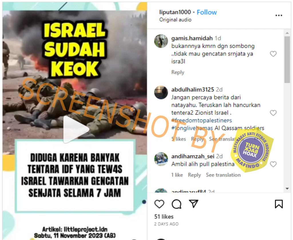 Beredar kabar di Instagram yang menyebut bahwa Israel Defense Forces (IDF) menawarkan gencatan senjata selama 7 jam kepada Hamas, karena banyak tentara IDF yang tewas dalam peperangan di jalur Gaza tersebut.