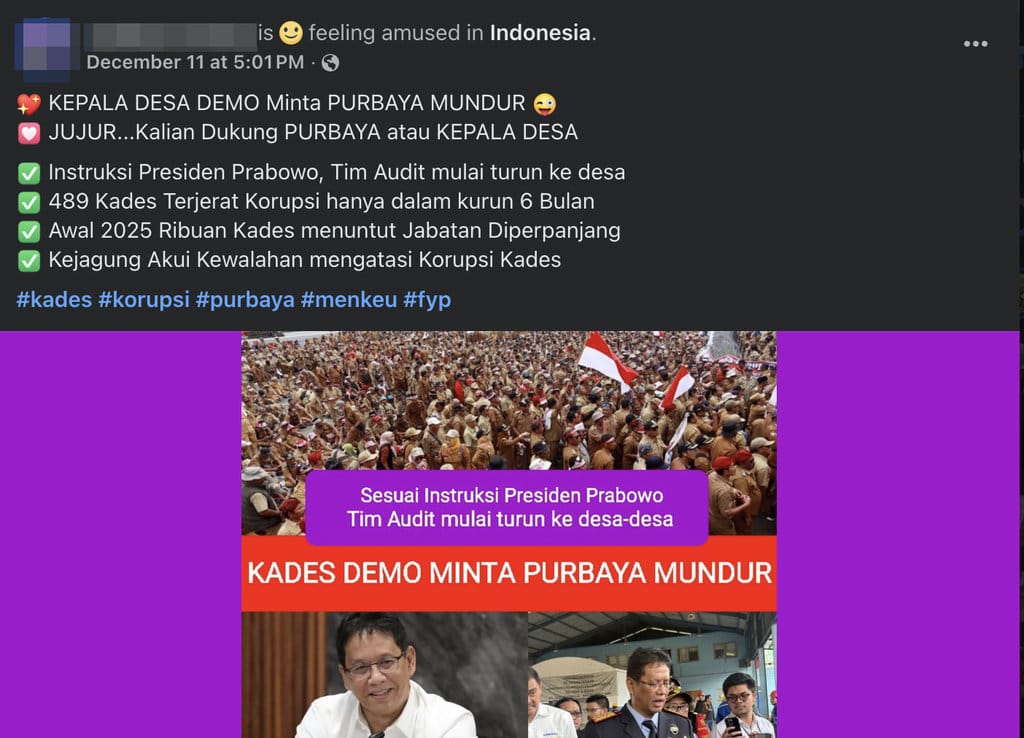 Unggahan tersebut turut disertai kolase gambar kerumunan massa berseragam cokelat yang diklaim sebagai aksi demonstrasi kepala desa, serta foto Purbaya Yudhi Sadewa. Pada gambar juga tertera teks tambahan, antara lain “KADES DEMO MINTA PURBAYA MUNDUR” dan “JUJUR, KALIAN DUKUNG PURBAYA ATAU PARA KADES YANG HAUS DANA DESA”.