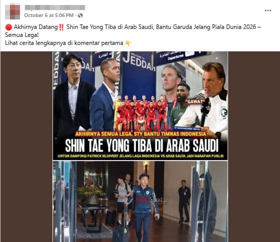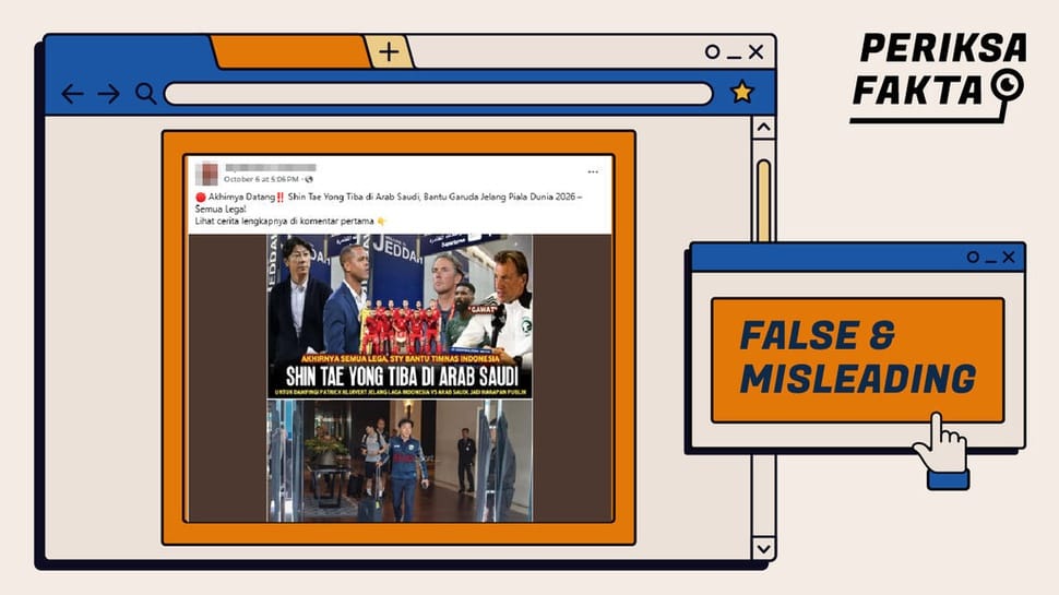 Hasil penelusuran fakta menunjukkan bahwa unggahan dengan klaim Shin Tae-yong mendampingi Patrick Kluivert melatih timnas Indonesia melawan Arab Saudi pada 2025 bersifat salah dan menyesatkan (false & misleading).
