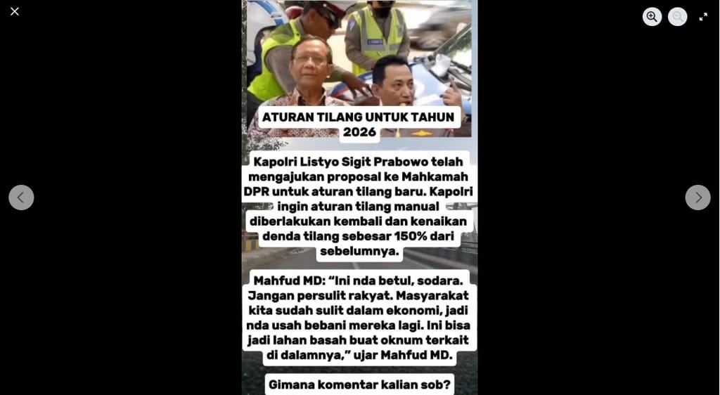 Berdasarkan penelusuran fakta yang sudah dilakukan, narasi soal aturan baru tilang 2026 dengan kenaikan denda sebanyak 150 persen telah dinyatakan tidak benar oleh Komdigi dan Divisi Humas Polri, sehingga bersifat salah dan menyesatkan (false and misleading).