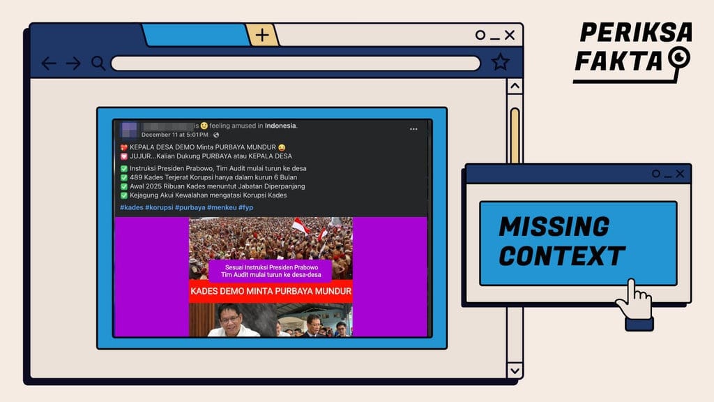 Berdasarkan penelusuran fakta, klaim yang menyebut adanya aksi demonstrasi besar-besaran kepala desa yang menuntut Purbaya Yudhi Sadewa mundur dari jabatannya sebagai Menteri Keuangan adalah kekurangan konteks (missing context).