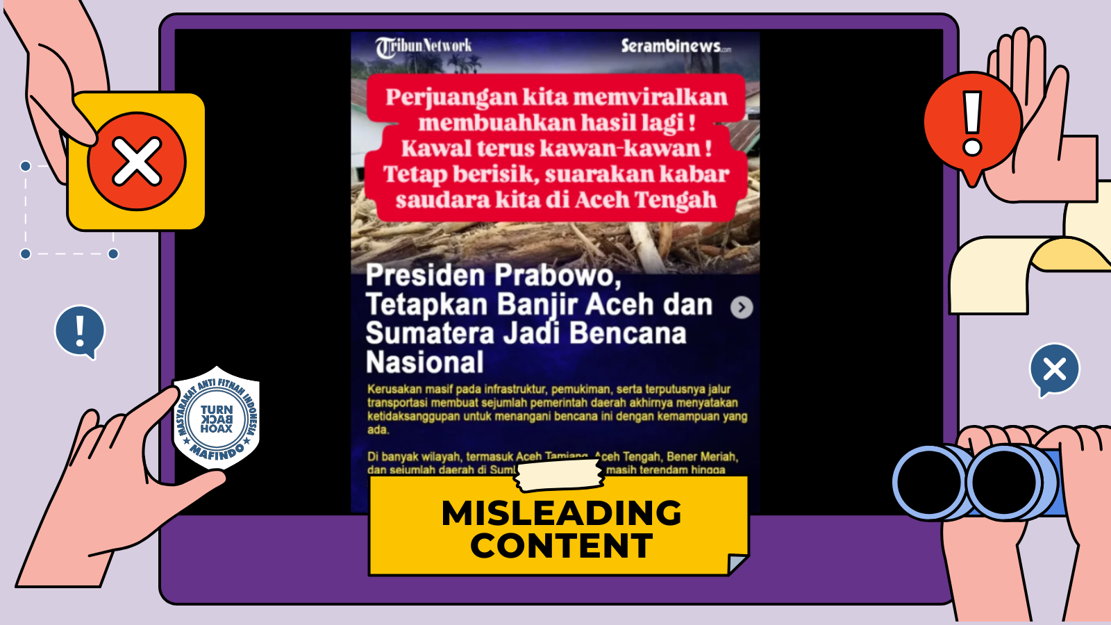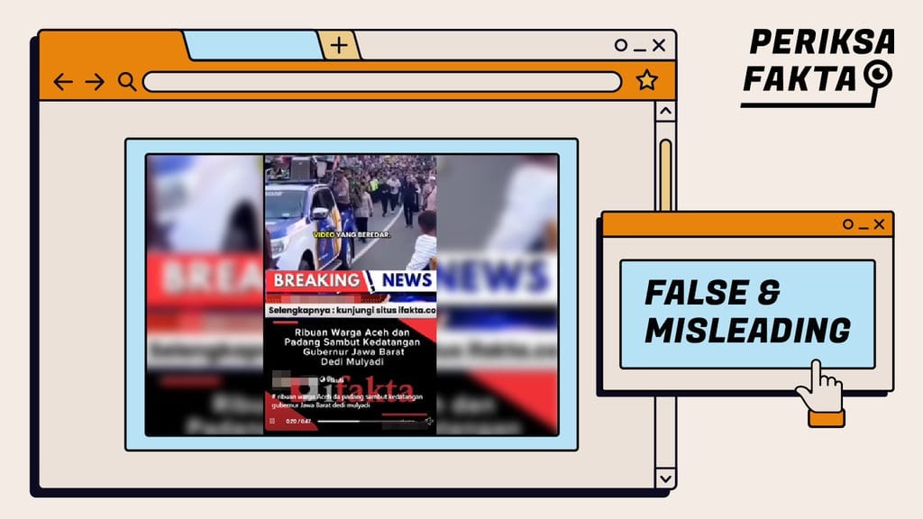 Hasil penelusuran fakta menunjukkan, beredar video di media sosial yang mengklaim menunjukkan momen ketika Dedi Mulyadi disambut ribuan warga di Aceh dan Padang bersifat salah dan menyesatkan (false and misleading).Video yang tersebar adalah momen saat Dedi Mulyadi menghadiri perayaan milad Pondok Pesantren Suryalaya di Tasikmalaya pada September lalu. Video itu sama sekali tidak berkaitan dengan kunjungan Dedi Mulyadi, ke Sumatera pada awal Desember 2025 untuk menyalurkan bantuan kepada korban banjir yang melanda tiga provinsi di wilayah tersebut.