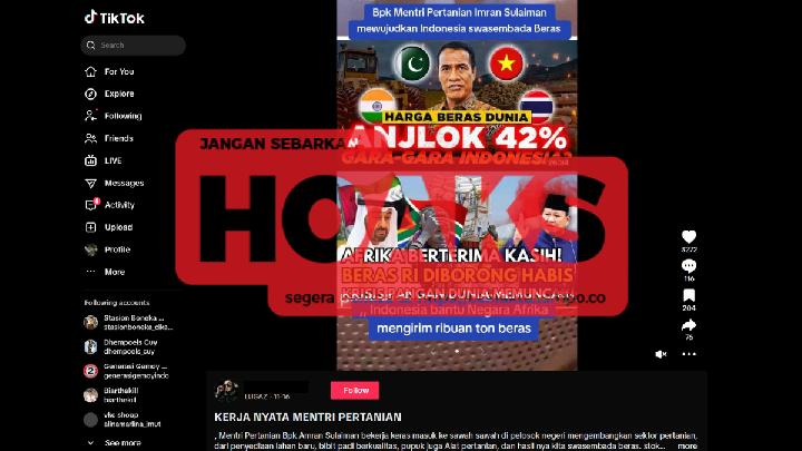 Konten itu memuat kolase foto Presiden Prabowo Subianto dan Amran Sulaiman dengan judul “Harga beras dunia anjlok 42 persen gara-gara Indonesia”. “Afrika berterima kasih hingga beras RI diborong habis.. Krisis pangan dunia memuncak, Indonesia bantu negara Afrika mengirim ribuan ton beras,” demikian narasi yang juga termuat dalam konten.