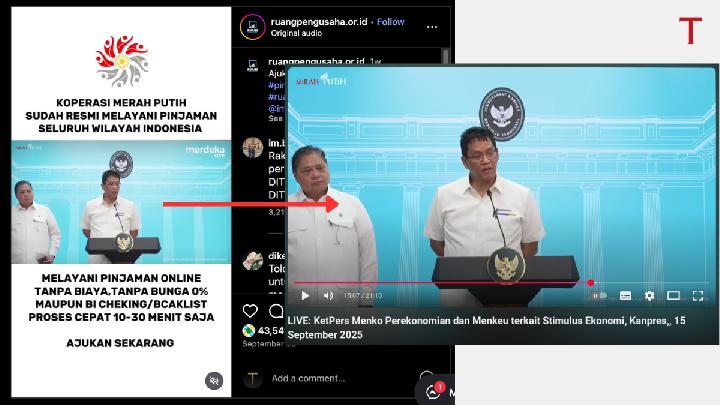 Klip yang beredar identik dengan rekaman konferensi pers yang diunggah kanal YouTube Sekretariat Presiden pada 15 September 2025. Dalam video aslinya, Menteri Keuangan Purbaya tidak pernah menyebut bahwa Koperasi Desa Merah Putih menyediakan layanan pinjaman online.
