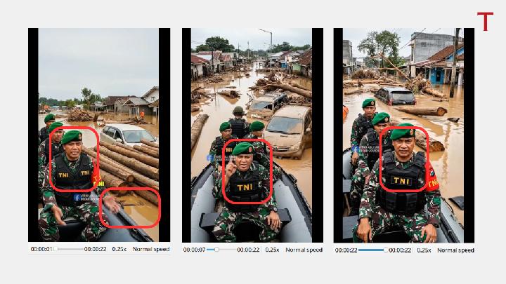 Tempo menemukan serangkaian kejanggalan pada video pertama melalui analisis manual. Kejanggalan tersebut meliputi bentuk rompi dan badge lengan yang berubah-ubah, jari tangan yang seolah terputus saat tangan bergerak, hingga permukaan air yang tetap tenang ketika perahu karet melintasinya. Indikasi semacam ini lazim terdeteksi pada konten yang dihasilkan akal imitasi.