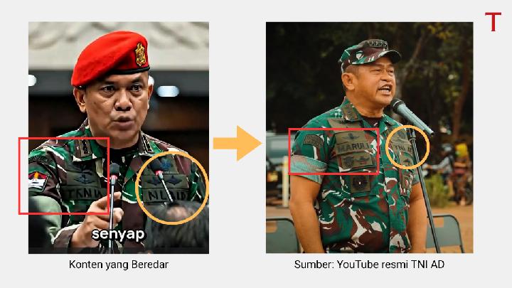 Tempo menemukan sejumlah kejanggalan dalam video yang beredar setelah mencocokkan seragam TNI yang Kepala Staf Angkatan Darat Maruli Simanjuntak gunakan di kanal YouTube resmi TNI AD.