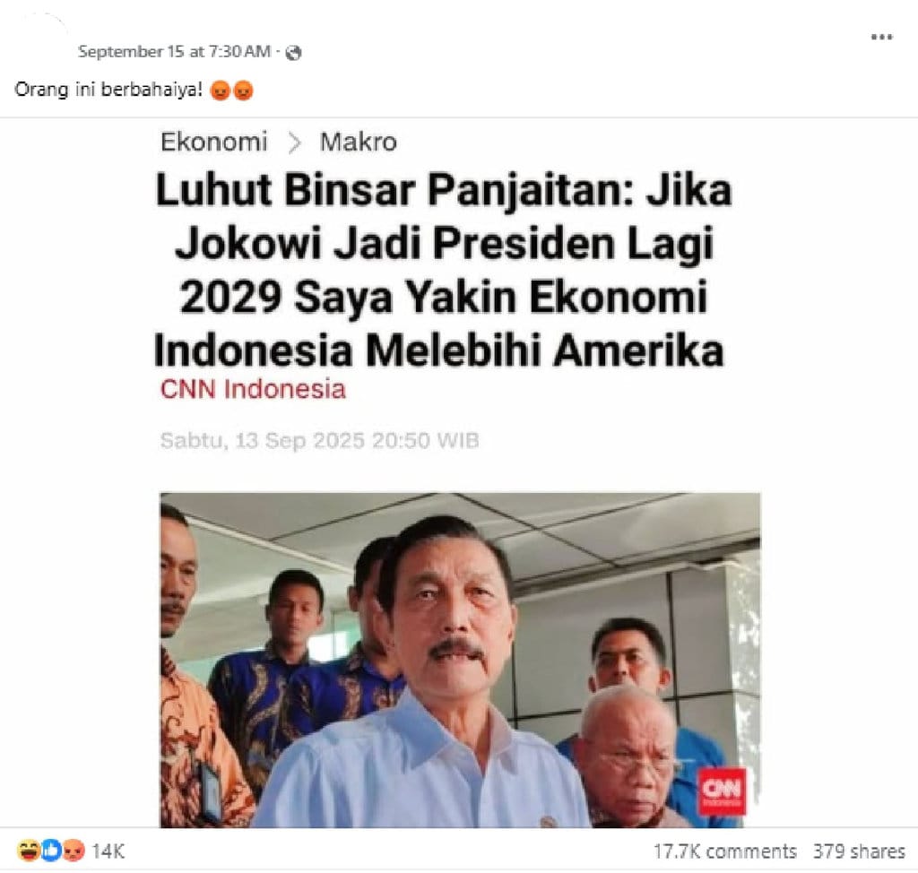“Luhut Binsar Panjaitan: Jika Jokowi Jadi Presiden Lagi 2029, Saya Yakin Ekonomi Indonesia Melebihi Amerika”, begitu bunyi judul berita dengan font yang tidak umum digunakan media CNN Indonesia. Akun pengunggah juga turut membubuhkan keterangan yang menyebut bahwa Luhut berbahaya.