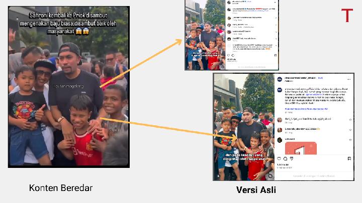 Tempo memverifikasi foto dan video itu dengan pencarian gambar terbalik di Google serta membandingkan narasinya dengan sumber kredibel. Hasilnya, peristiwa dalam konten tersebut adalah saat Sahroni berkampanye pada pemilihan umum 2024.
