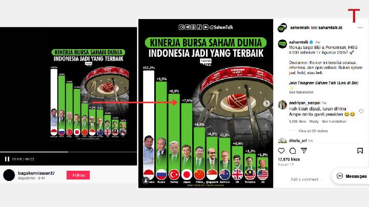 SEBUAH video beredar di TikTok [arsip] dan Instagram dengan klaim bursa saham Indonesia menempati peringkat terbaik di dunia pada 14 Agustus 2025.
