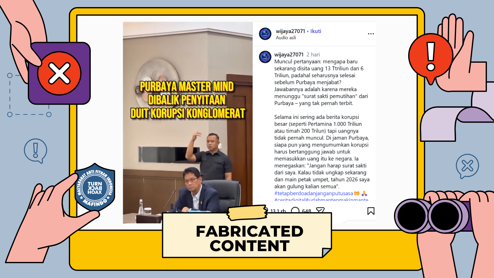 Akun Instagram "wijaya27071" pada Sabtu (27/12/2025) mengunggah video [arsip] yang menyebut Menteri Keuangan Purbaya Yudhi Sadewa sebagai otak dibalik penyitaan uang triliunan rupiah, lahan sawit jutaan hektare, serta penindakan pajak dan ekspor ilegal, dengan gambaran seolah-olah ia memiliki kekuasaan absolut atas arus uang negara dan proses penegakan hukum.
