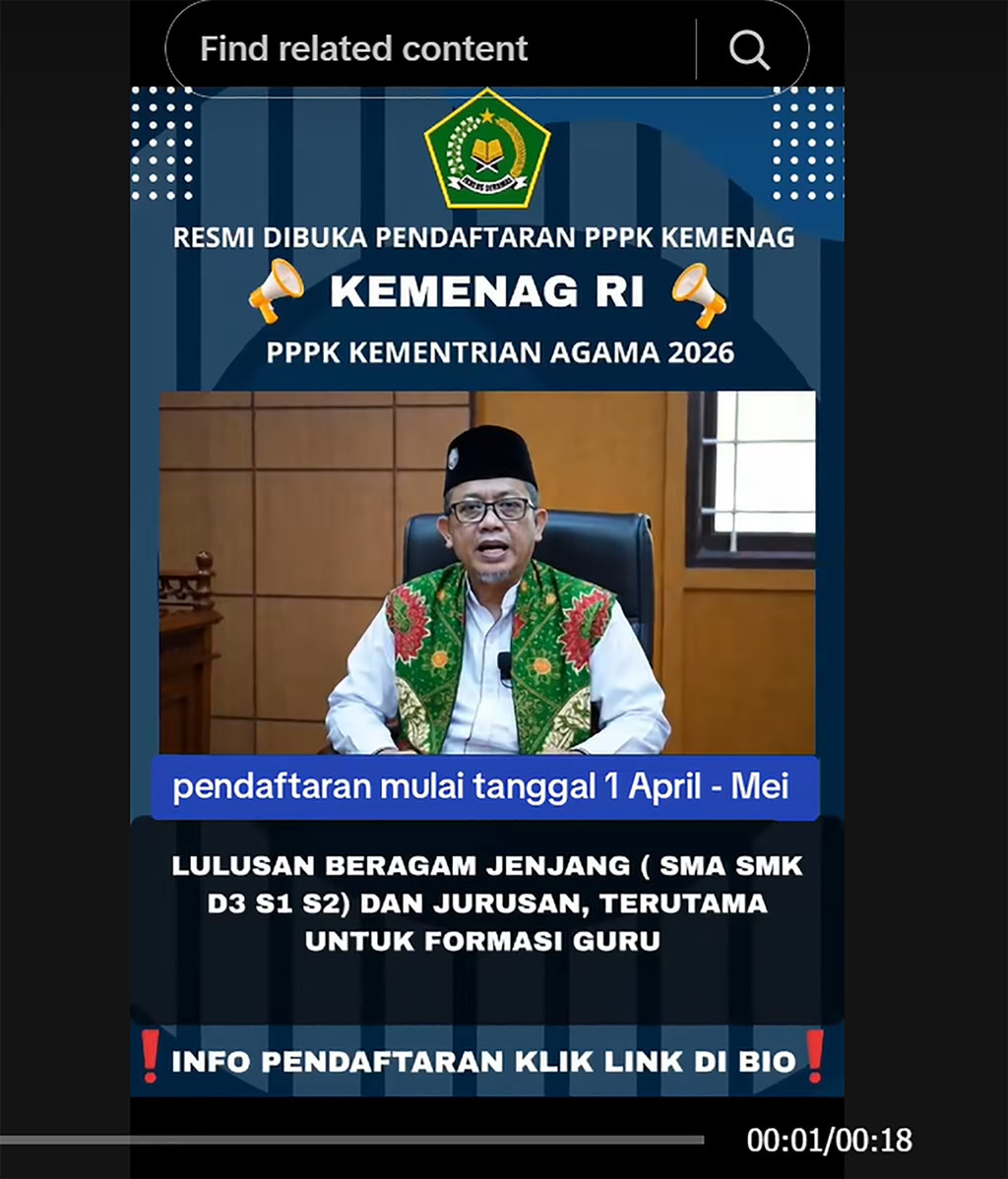 Tirto juga menemukan banyak unggahan serupa pada akun TikTok tersebut “infopendaftarankemenag” ini, ini, dan ini, serta pada akun Instagram @arusbudi999. Semua unggahan video tersebut menampilkan gambar yang berbeda, namun berkaitan dengan pendaftaran PPPK Kemenag 2026. Dalam unggahan tersebut juga dituliskan tanggal yang berbeda untuk pendaftaran PPPK Kemenag 2026 yaitu pada 8 Januari sampai 27 Februari 2026 dan video lainnya mencantumkan tanggal 25 Februari sampai 26 Maret 2026.