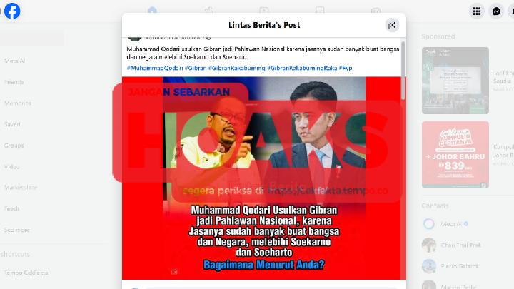 NARASI bahwa Wakil Kepala Staf Kepresidenan Muhammad Qodari mengusulkan Wakil Presiden Gibran Rakabuming Raka sebagai pahlawan nasional beredar di X [arsip] dan Facebook pada akhir Oktober 2025.