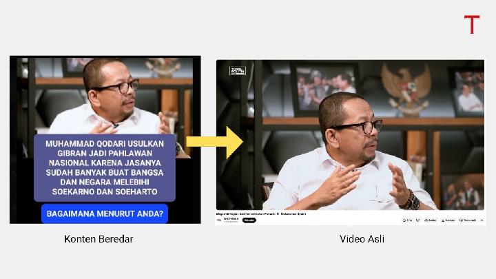 Tempo memverifikasi konten tersebut dengan pencarian gambar terbalik lewat Google dan membandingkannya dengan sumber kredibel. Hasilnya, Wakil Kepala Staf Kepresidenan Muhammad Qodari tidak pernah mengusulkan Gibran sebagai pahlawan nasional.
