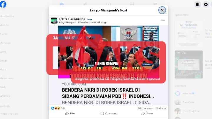 SEJUMLAH akun di X dan Facebook [arsip] membagikan tautan video di YouTube berjudul Bendera NKRI dirobek Israel di Sidang Perdamaian PBB.