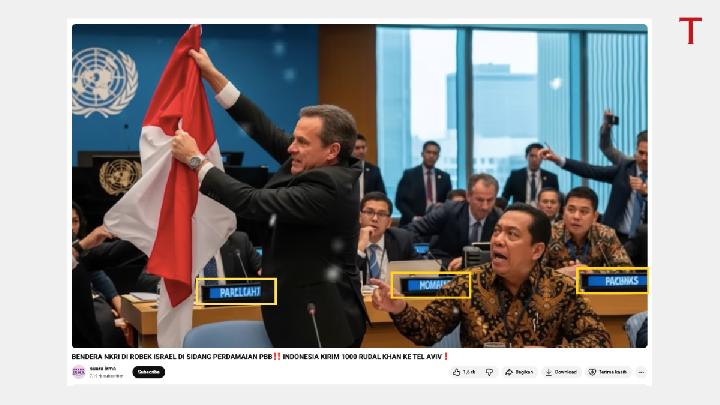 Gambar pada menit ke-1:59 juga tampak berbeda dengan tampilan meja delegasi Indonesia saat Sidang Umum PBB diselenggarakan pada 22 September 2025, Foto delegasi Indonesia dalam Sidang Umum PBB pernah dipublikasikan oleh Antara.