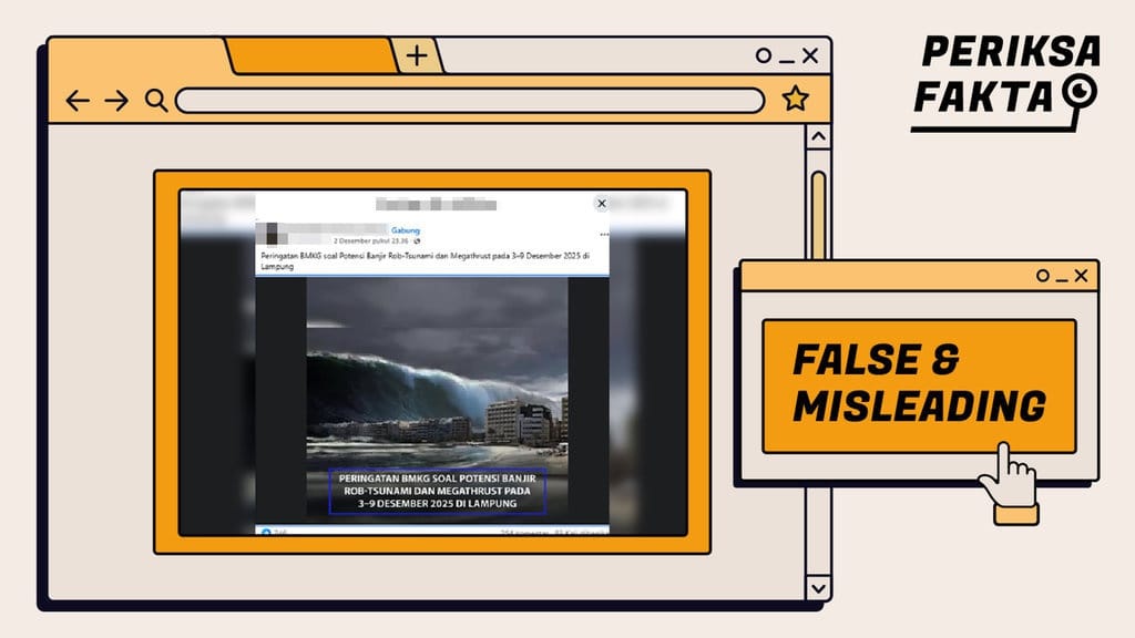 Hasil penelusuran fakta menunjukkan, narasi yang menyebut bahwa Badan Meteorologi, Klimatologi dan Geofisika (BMKG) memperingatkan potensi ancaman tsunami dan megathrust di Provinsi Lampung pada tanggal 3-9 Desember 2025 bersifat salah dan menyesatkan (false and misleading).