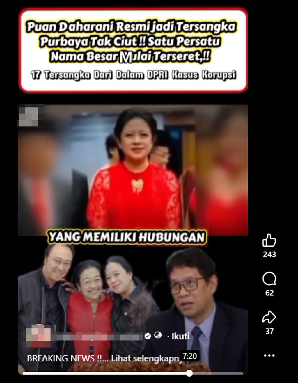 tirto.id - Sebuah unggahan video beredar di media sosial Facebook mengklaim Ketua DPR RI Puan Maharani resmi menjadi tersangka kasus korupsi. Dalam unggahan disebutkan terdapat 17 orang tersangka kasus korupsi dari dalam DPR RI.