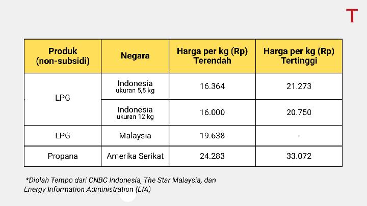 Tempo membandingkan harga LPG non-subsidi menggunakan data dari CNBC Indonesia, The Star Malaysia, dan Energy Information Administration (EIA) milik pemerintah Amerika Serikat.