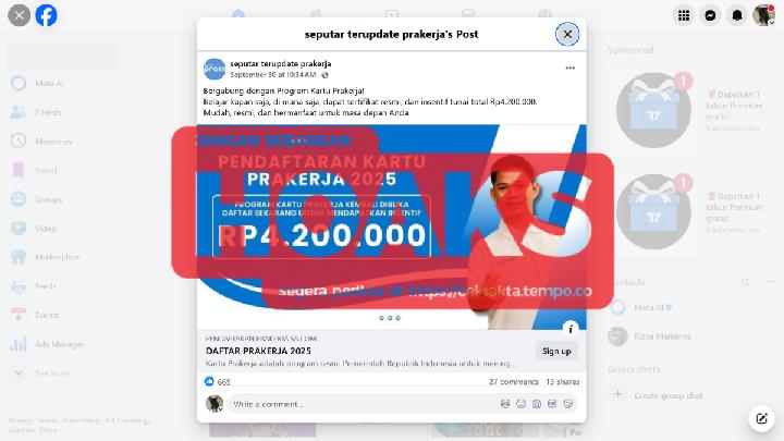 INFORMASI tentang pendaftaran Kartu Prakerja 2025 beredar di Facebook [arsip] pada 30 September 2025. Unggahan itu memuat tautan pendaftaran di alamat pendaftaran.prakerja.sa.com.
