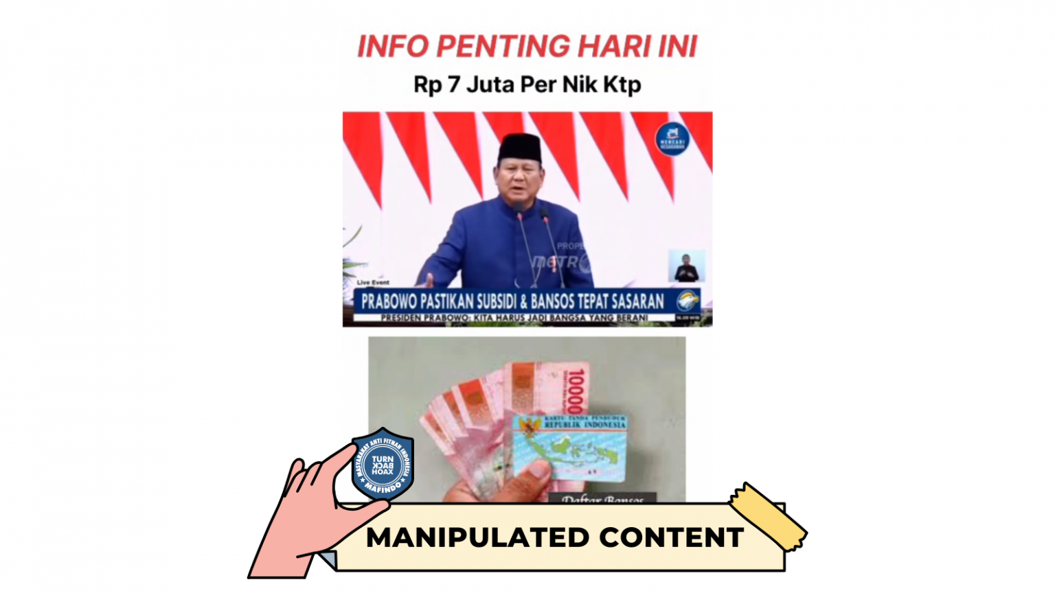 Unggahan berisi narasi “Prabowo bagikan bansos Rp7 juta per KTP” merupakan konten yang dimanipulasi (manipulated content).