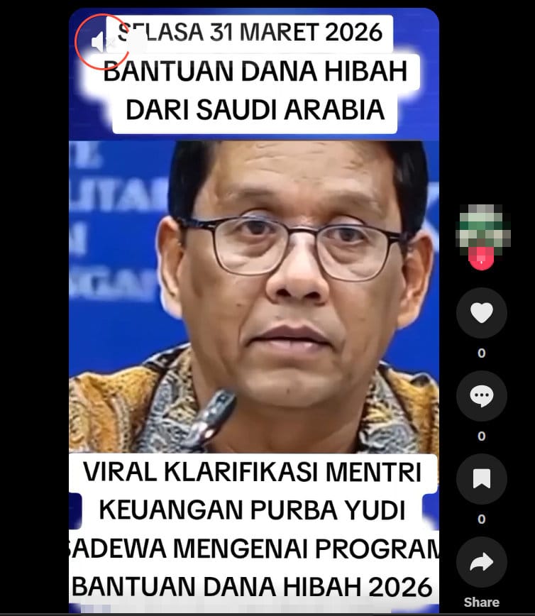 “Selasa, 31 Maret 2026 Bantuan Dana Hibah dari Saudi Arabia. Viral klarifikasi Purba Yudhi Sadewa mengenai program Bantuan Dana Hibah 2026 dari Saudi Arabia,” begitu narasi tertulis dalam video.