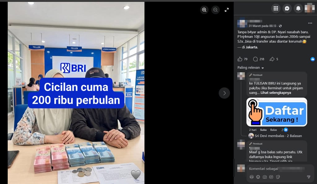 Dalam kolom komentar pengunggah menyematkan tautan yang diklaim untuk mendaftar pinjaman, “ke TULISAN BIRU ini Langsung ya pak/bu Jika Berminat untuk pinjam uang https://ln.run/Ajukan-dana-pinjaman-disinihttps://ln.run/Ajukan-dana-pinjaman-disini. Setelah diajukan Biar Saya proses ACC dan proses langsung transfer sekarang juga ya.”