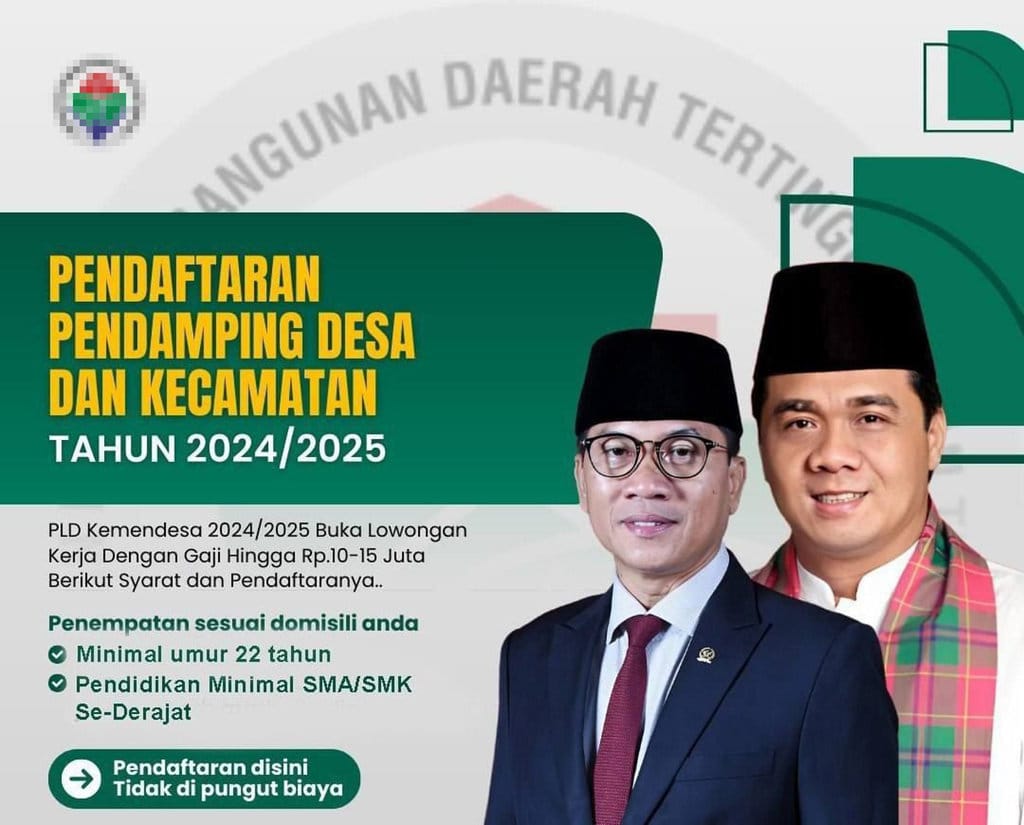 Seperti baru-baru ini, di Facebook, beredar unggahan berisi informasi lowongan pekerjaan sebagai Pendamping Lokal Desa (PLD) Kementerian Desa dan Pembangunan Daerah Tertinggal (Kemendes PDT). Rekrutmen tersebut dibuka bagi Warga Negara Indonesia (WNI) berusia 23-45 tahun dengan minimal pendidikan SMA/SMK.