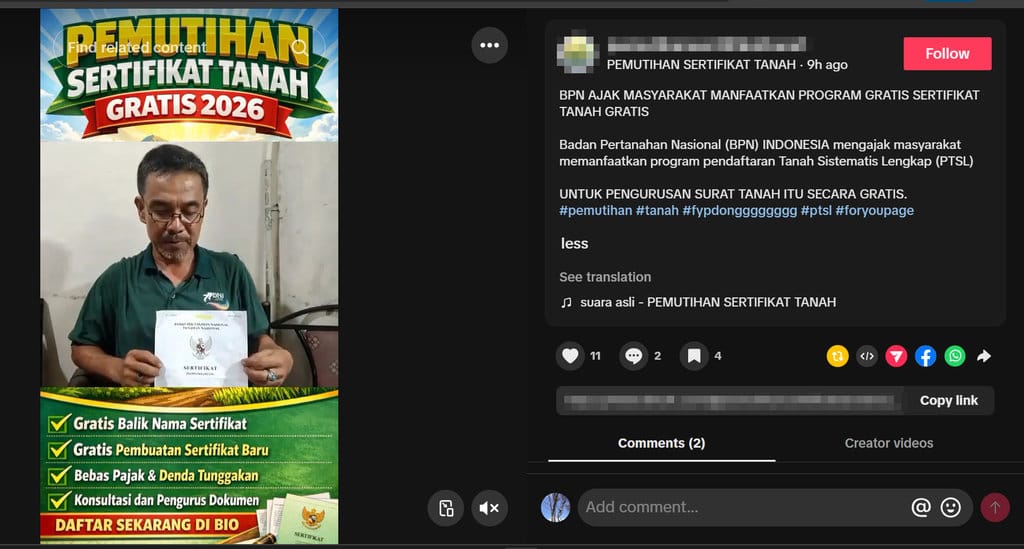 “Terima kasih, BPN. Berkat pemutihan sertifikat tanah, semuanya gratis. (0:04) Cek dan daftarkan link ada di bio,” Begitu narasi yang diucapkan dalam video.