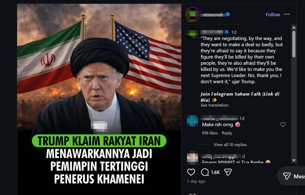 tirto.id - Beredar unggahan di media sosial Instagram mengklaim bahwa rakyat Iran menawarkan Presiden Amerika Serikat Donald Trump menjadi pemimpin tertinggi Iran sebagai penerus Ali Khamenei yang wafat pada Februari 2026 dalam serangan udara gabungan yang dilakukan oleh Amerika Serikat dan Israel yang menargetkan kantornya di Teheran.