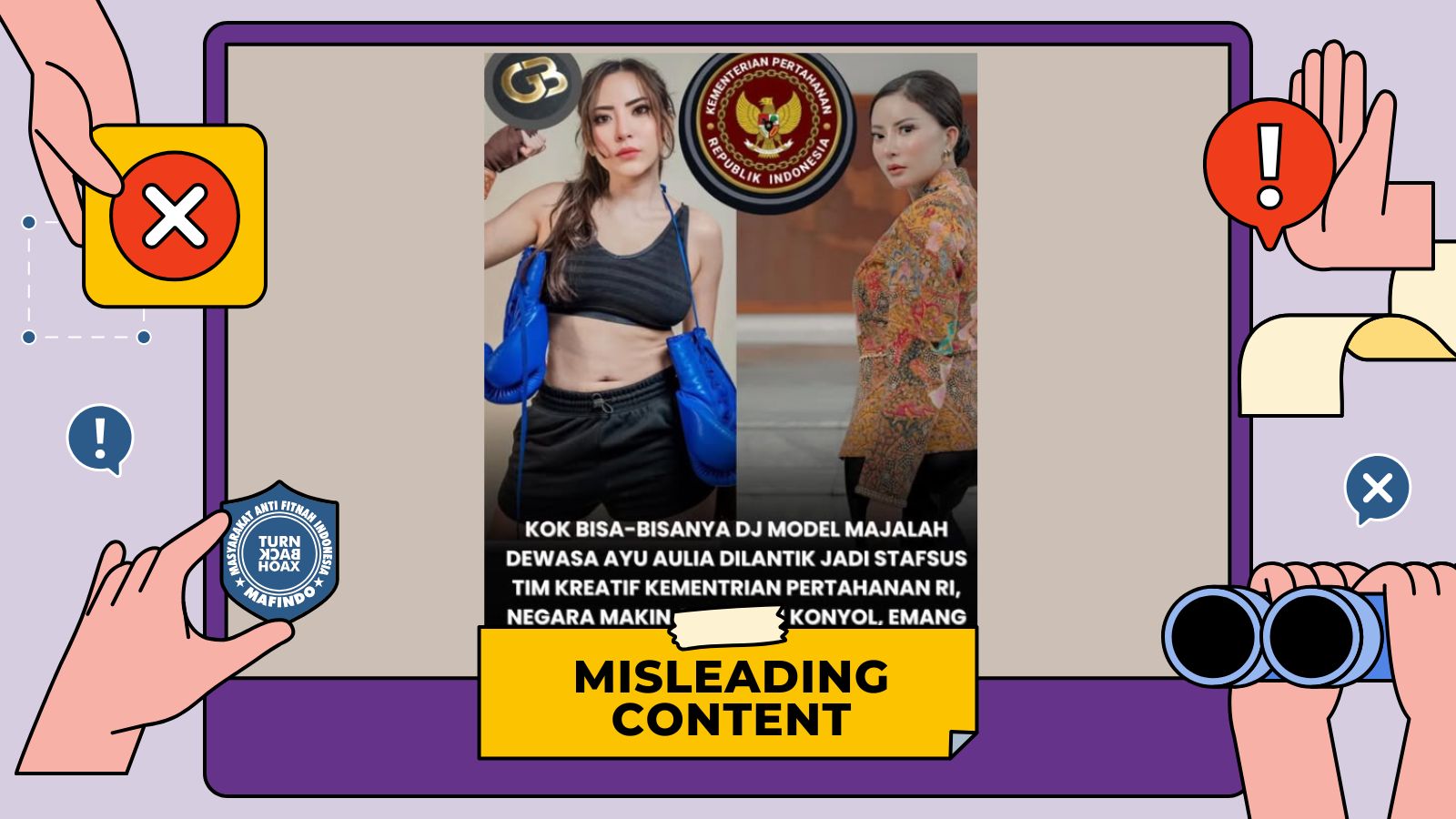 Selebgram Ayu Aulia bukan tim kreatif Kemenhan, melainkan anggota GBN-MI yang terpisah dari Kemenhan. Unggahan dengan narasi “Mantan model dewasa dilantik jadi tim kreatif Kemenhan” merupakan konten yang menyesatkan (misleading content).