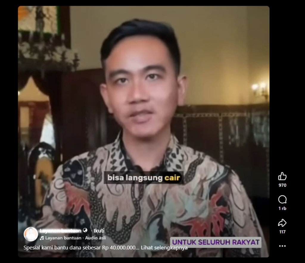 Lantas, benarkah Wakil Presiden Gibran membagikan bantuan dana sebesar Rp40 juta hanya dengan syarat menyukai dan membagikan video tersebut?