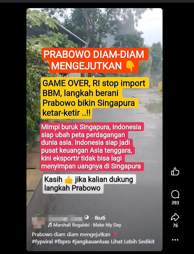 “Prabowo diam-diam mengejutkan. Game over, RI stop import BBM, langkah berani Prabowo bikin Singapura ketar-ketir..!! Mimpi buruk Singapura, Indonesia siap ubah peta perdagangan Asia. Indonesia siap jadi pusat keuangan Asia Tenggara, kini eksportir tidak bisa lagi menyimpan uangnya di Singapura. Kasih 👍jika kalian dukung langkah Prabowo,” begitu keterangan tertulis dalam video.