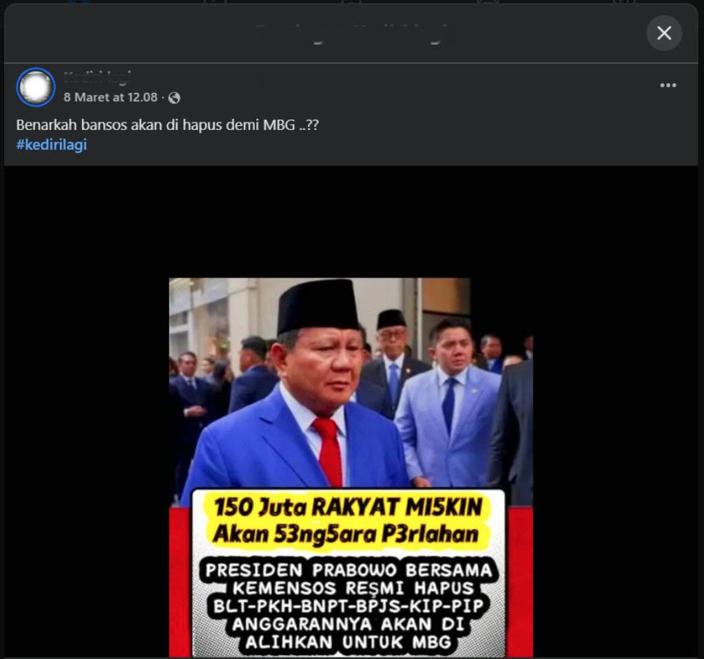 Beredar sebuah unggahan yang menyebut Presiden Prabowo bersama Kementerian Sosial atau Kemensos resmi menghapus bantuan sosial, antara lain BLT, PKH, BPNT, KIP, dan PIP. Penghapusan itu disebut dilakukan untuk mengalihkan anggaran ke MBG.
