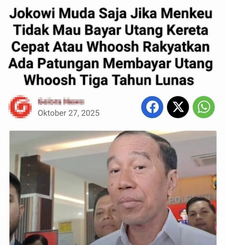 Narasi itu diunggah oleh akun Facebook bernama “Agus Abdurrahim”(arsip) Senin (27/10/2025) melalui unggahan tangkapan layar artikel berita yang mencatut nama Gelora News berjudul, "Jokowi Muda Saja Jika Menkeu Tidak Mau Bayar Utang Kereta Cepat Atau Whoosh Rakyatkan Ada Patungan Membayar Utang Whoosh Tiga Tahun Lunas".