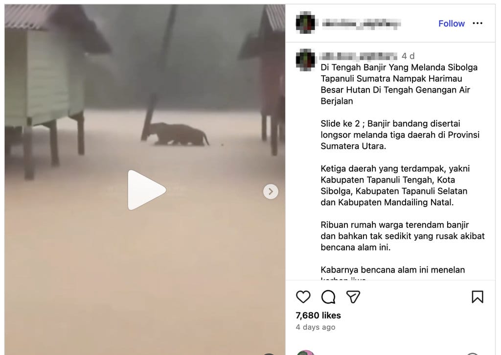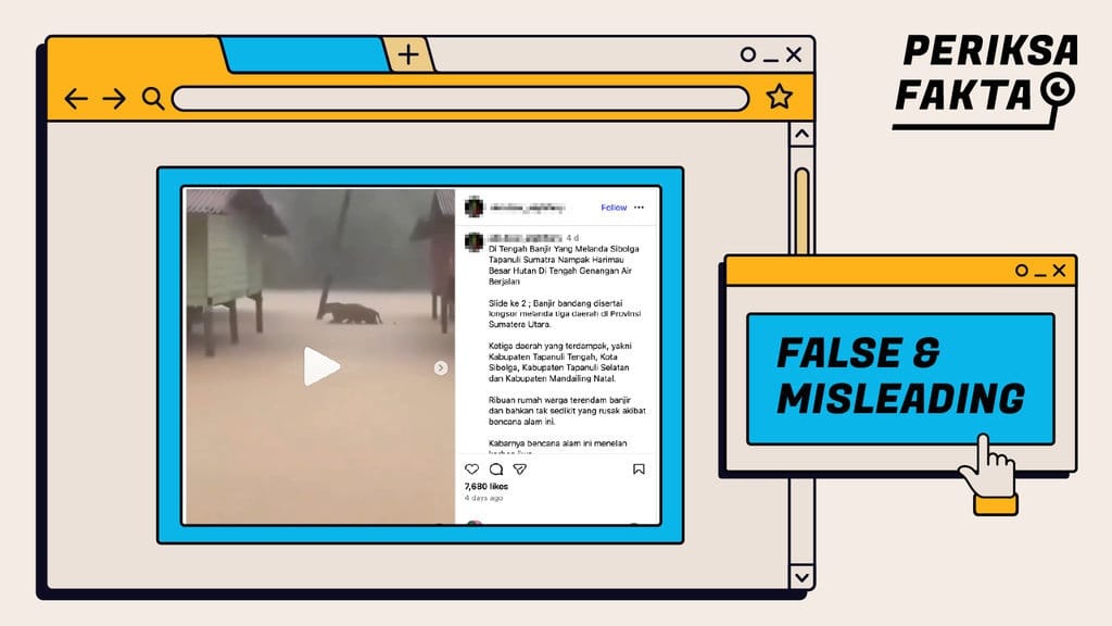 Penelusuran menunjukkan bahwa video kemunculan harimau di permukiman warga di Sibolga Tapanuli saat banjir terjadi adalah salah dan menyesatkan (false and misleading).