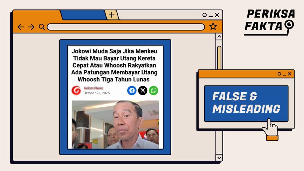 Hingga Jumat (7/11/2025) atau saat artikel periksa fakta ini ditulis, Tirto tidak menemukan adanya pernyataan Presiden Joko Widodo yang menyebut rakyat akan melunasi utang proyek Kereta Cepat Jakarta-Bandung (Whoosh) dalam tiga tahun. Dengan demikian, judul dan narasi dalam unggahan yang beredar merupakan hasil suntingan dan tidak sesuai dengan fakta sebenarnya.