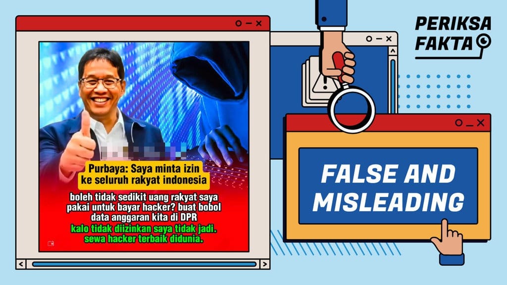 Hasil penelusuran fakta menunjukkan bahwa klaim yang menyebut bahwa Purbaya meminta izin kepada rakyat Indonesia untuk menggunakan uang negara untuk menyewa peretas (hacker) dalam rangka membobol data anggaran di DPR bersifat salah dan menyesatkan (false and misleading).