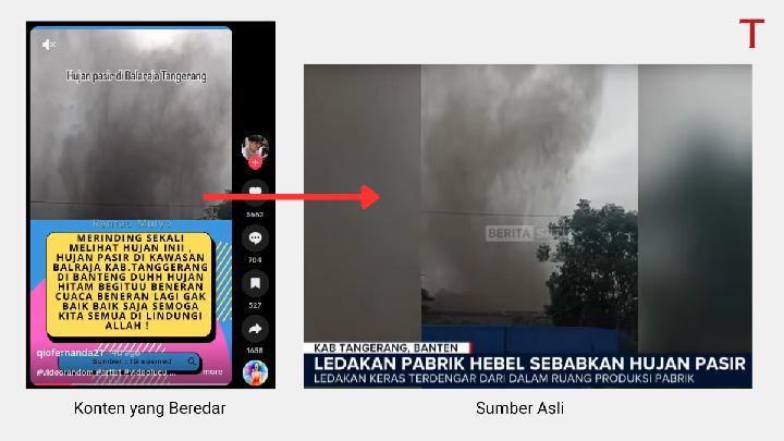 Video tersebut menampilkan kepulan pasir yang beterbangan tertiup angin. Narasi dalam video menyatakan, “Merinding sekali melihat hujan ini, hujan pasir di kawasan Balaraja, Kabupaten Tangerang di Banten. Duh beneran cuaca beneran, gak baik-baik saja. Semoga kita semua dilindungi Allah.”