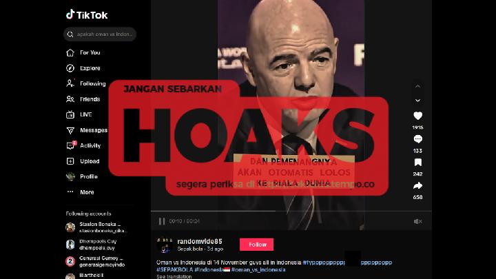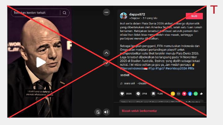 Konten itu berasal dari akun TikTok @dappa872 [arsip]. Saat diperiksa, pemilik akun menulis bahwa video itu hasil suntingan dan dibuat sebagai satire. Video tersebut seolah menunjukkan Timnas Indonesia masih punya peluang lolos ke Piala Dunia 2026 dengan mengalahkan Oman di kualifikasi tambahan. “Ini video editan ya gaes,” tulis pemilik akun.