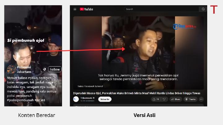Tempo memverifikasi video itu lewat pencarian gambar terbalik Google dan membandingkan narasi dengan sumber kredibel. Hasilnya, sosok anggota Brimob tersebut bukan pelaku yang melindas pengendara ojol, Affan Kurniawan. Dia adalah perwakilan Brimob yang menemui massa pengemudi ojol yang datang ke Mako Brimob, Kwitang, Jakarta Pusat, pada 28 Agustus 2025.