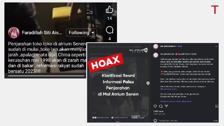 “Sehubungan dengan beredarnya video dan informasi di media sosial yang menyebutkan adanya penjarahan serta massa masuk ke Mal Atrium Senen, kami tegaskan bahwa informasi tersebut tidak benar atau hoaks,” penggalan keterangan itu.